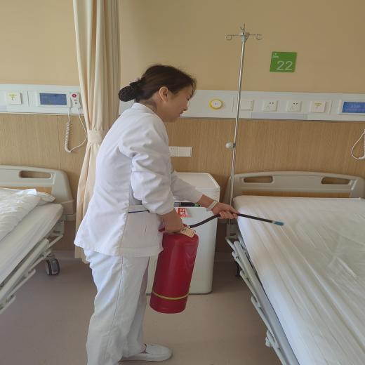 随着模拟火警信号骤然响起,演练正式启动。假设神经内科4病区L 21床因棉被着火引发火情,当班护士第一时间发现火情后,立即大声呼救,按下手动报警按钮,同时快速拨打保卫科电话精准上报火情位置、火势情况,同时当班另一位护士迅速取用就近灭火器开展初期火势扑救。
