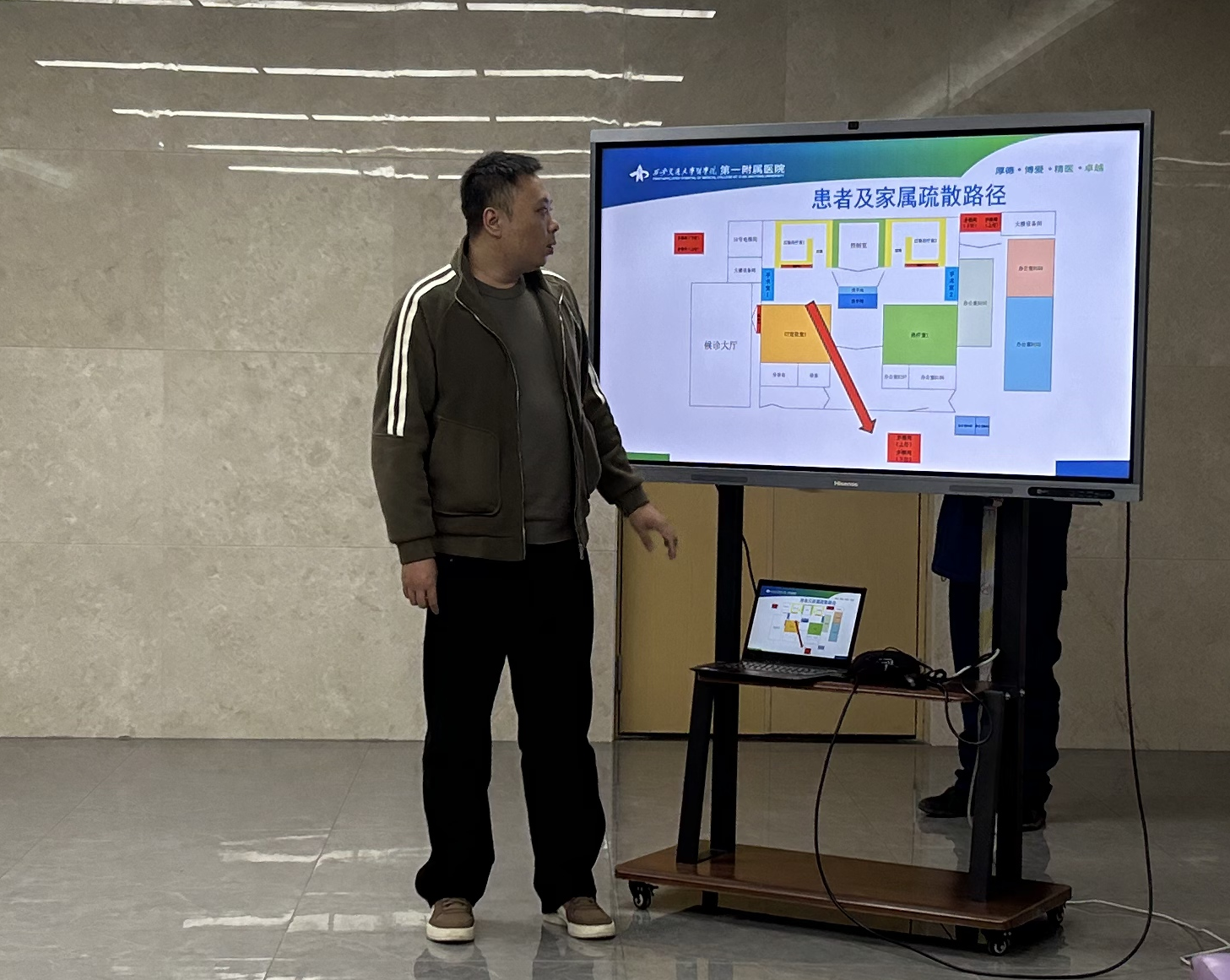 基建规划办公室裴东工程师向演习参与人员介绍了负一层放疗科所辖区域的消防设施配备情况和紧急情况下应急疏散路线的选择,从烟感、气体灭火喷淋系统、应急照明、防火卷帘、消防栓、步梯间等多维角度展示了负一层消防设施的常态、紧急态、触发态等不同情况下的处理处置方法。对大楼情况了如指掌的裴工,配合专业的讲解和精彩的分享,引来大家的阵阵掌声。