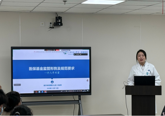 为深入贯彻国家医保基金监管最新政策,提升介入手术室全体人员对医保基金监管严峻形势的认识和规范医疗服务行为,确保医保基金安全、高效、合理使用,12月12日在梅娜护士长与白婷副护士长的安排下,特邀请我院医疗保险管理办公室贠瑞燕老师在影像楼四楼会议室为介入手术室全体人员进行了一场针对性强、内容详实的“医保基金监管形势及规范要求”专项培训。本次培训聚焦介入诊疗领域特点,从医保基金监管形势、院内管理、医疗服务价格管理政策到常见问题及规范要求进行全面讲解,旨在筑牢介入诊疗领域的医保基金安全防线。