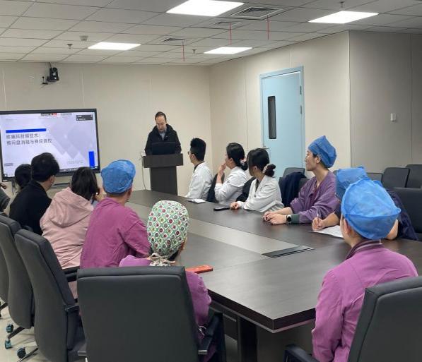 2025年10月随着影像1楼介入手术室新手术间投入使用,根据院方安排,介入手术室开始开展疼痛科手术。为了更好的配合院方对疼痛科的学科规划,保证疼痛科介入手术患者的医疗安全,以及优化疼痛科介入手术配合流程,2025年12月12日,介入手术室与疼痛科医护团队进行深度交流,在影像楼四楼会议室开展系列培训相关活动。本次培训由介入手术室梅娜护士长、白婷副护士长安排规划,疼痛科每晓鹏主任带队、聂会勇教授授课,疼痛科闫芍药护士长,王诗雨医生,以及介入手术室全体护理人员共同参加。