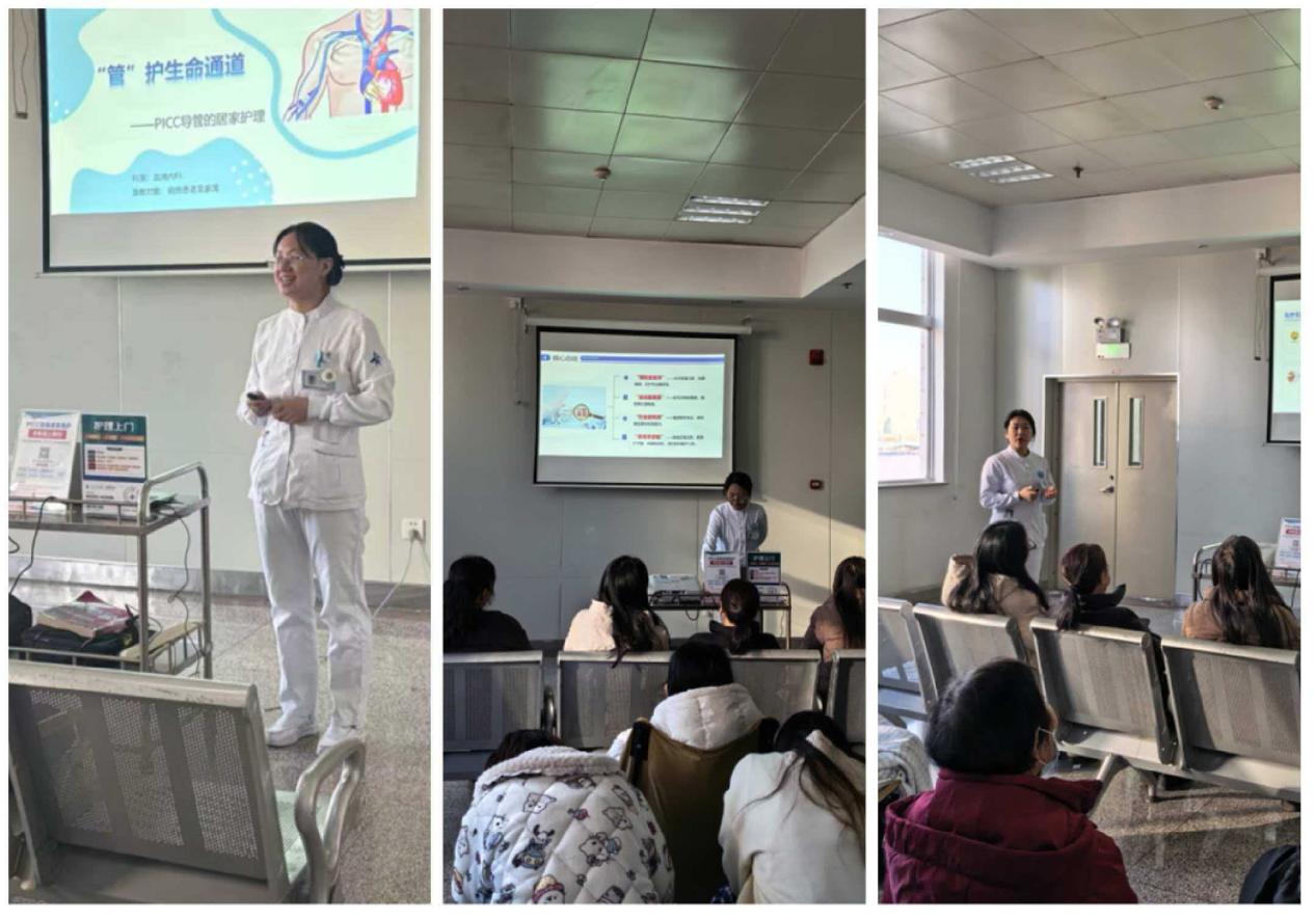随后的健康教育宣讲环节,聚焦血液病患者常见的居家护理难点与需求,由科室资深护理骨干进行专业分享。王芳主管护师详细讲解了经外周静脉置入中心静脉导管(PICC)的日常观察、维护注意事项、沐浴保护方法以及出现异常情况(如渗血、脱出、感染迹象等)时的应急处理措施,减轻了携带管路患者的居家焦虑。针对化疗后易发生的口腔黏膜炎,戴攀凤护师系统介绍了有效的口腔清洁方法、适宜的漱口液选择、饮食调整策略以及黏膜损伤后的舒缓技巧,帮助患者减轻痛苦,维持基本营养摄入。刘田田护师结合营养学知识,为化疗期间患者提供了科学的饮食指导,包括如何保证足够热量与蛋白质摄入、选择易消化且卫生的食物、应对恶心呕吐等胃肠道反应的饮食调整方案,以及需要避免的食物种类等,助力患者改善营养状况,提升治疗耐受性。整个活动过程中,宣讲人语言通俗易懂,讲解细致入微,并设置了答疑互动环节。患者及家属们认真聆听,踊跃提问,就自身关心的问题与护理人员进行了深入交流,现场气氛融洽而热烈。护理团队对每一个问题都给予了耐心、专业的解答。