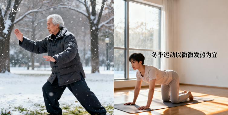 · 冬季运动应选择动作舒缓、强度适中的项目,如太极拳、散步、慢跑、瑜伽等。