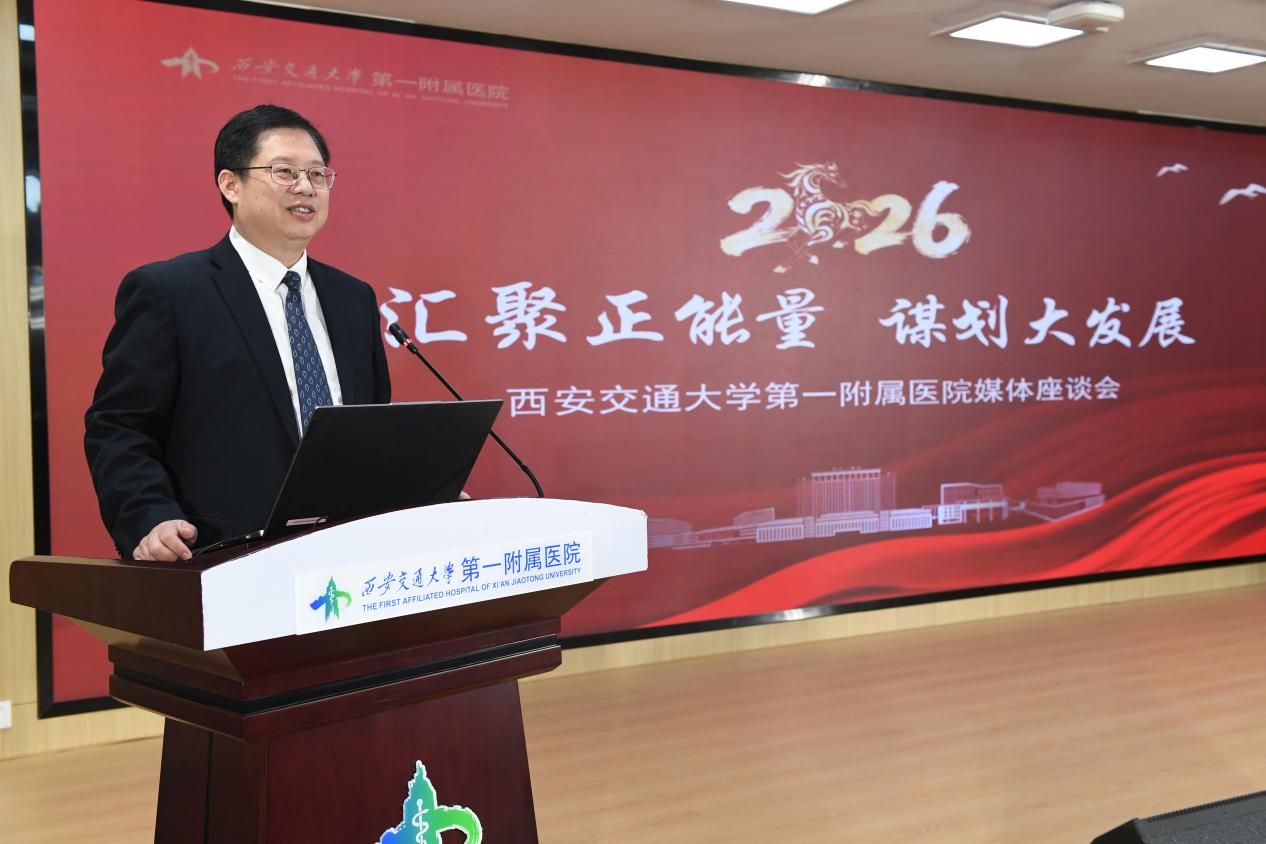 2026年1月16日下午,交大一附院在陆港院区组织召开2026年度媒体座谈会,与中、省、市、行业新闻媒体进行深入座谈交流。来自人民日报社、新华社、中央广播电视总台、经济日报社、中国日报、科技日报社、工人日报社、中国新闻社、中国青年报、国广国际在线、健康报社等中央及行业媒体陕西分社、驻陕记者站以及陕西日报、陕西电视台、西部网、群众新闻网、三秦都市报、西安日报、西安晚报、西安电视台、华商报、华商网、阳光报、新浪网、凤凰网、搜狐网、腾讯网等多家媒体代表参加座谈会,会议特邀西安交通大学党委宣传部副部长刘昱含,西安交通大学第二附属医院党委副书记党变玲、西安交通大学口腔医院党委副书记高琰出席会议,西安交通大学第一附属医院党委书记马辛格,副书记冯广林,一附院副院长李小鹏、王亚峰,陆港院区副院长李红霞、综合办公室副主任庞亮,健康医学科主任马茂、常务副主任缑永强,宣传部部长王睿、副部长刘炳圻、敦旺欢,精准外科与再生医学国家地方联合工程研究中心副主任刘晓丽等科室代表参加会议,会议由冯广林副书记主持。
