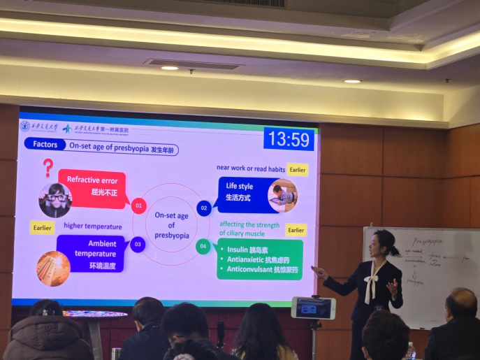 展示现场,范依萌老师以“老花眼(Presbyopia)”为题,进行了一堂精彩的全英文授课。课程伊始,范老师以一个生动的临床病例为切入点,巧妙导入,迅速激发了在场评委与学生代表团的兴趣与思考。随后,全面且细致地讲授了老花眼的发病机制、影响因素、临床表现与治疗方法。本次授课的亮点在于,范老师巧妙融入了当前老花眼矫正领域的专业前沿知识与最新进展,有效拓展了学生的学术视野,激发了他们的探究精神。授课过程中,范老师仪态从容淡定,举止优雅大方,将专业的眼科学知识娓娓道来,其英语发音标准流利,语速适中,对语音语调的把握恰到好处。