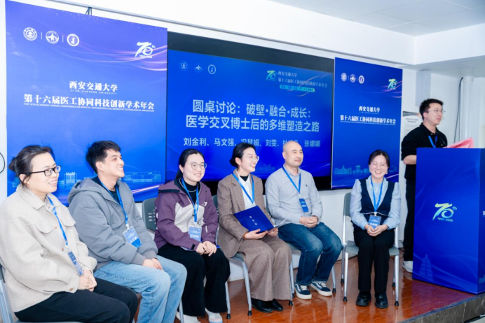 圆桌讨论环节围绕“医学交叉博士后的多维塑造之路”这一主题,特邀机械学院、前沿学院、生命学院、公共卫生学院及一附院的六位博士后展开深度交流。各位博士后结合自身科研经历一一分享体会,医工交叉的关键在于保持开放心态,主动学习跨领域知识,积极寻求合作契机,在实践中逐步打破学科界限,构建复合型知识结构。整场讨论气氛热烈,引发了在场观众的广泛共鸣。