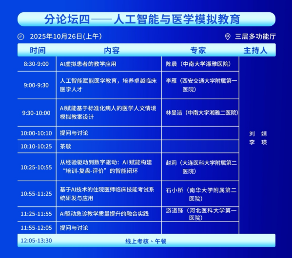 教学部李雁部长受邀在“分论坛四——人工智能与医学模拟教育”发言交流,她以“人工智能赋能医学教育,培养卓越临床医学人才”为题,从时代背景、西交实践、交医探索和未来展望四个方面,系统分享了我校及我院在人工智能赋能教育教学方面的探索实践与创新成果,与来自中南大学湘雅医院、大连医科大学附院、南华大学附院、河北医科大学附院等院校的专家们共同探讨了人工智能对医学教育的影响及数智时代医学模拟教育的革新路径,获得了现场专家的肯定。